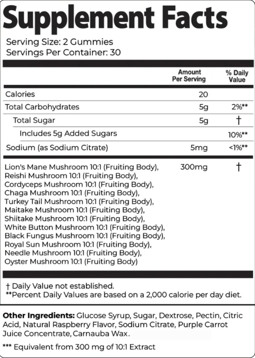 A powerful, tasty gummy with 3,000mg of functional mushrooms that support brain function, overall wellness, digestion, and mood.